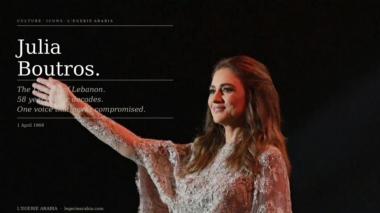 At 58, Julia Boutros has outlasted trends, political cycles, and the attention spans of a media industry that is permanently in search of the next thing. She has done this by understanding something that most artists learn too late, if they learn it at all: that longevity in culture is not achieved by remaining relevant. It is achieved by remaining true.